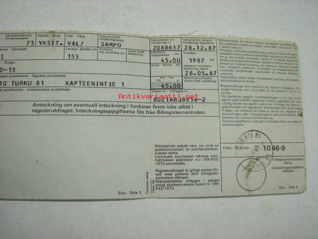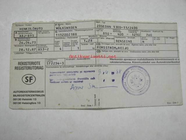 Volkswagen 2D Sedan 1300-11/2400 henkilöauto -rekisteriote