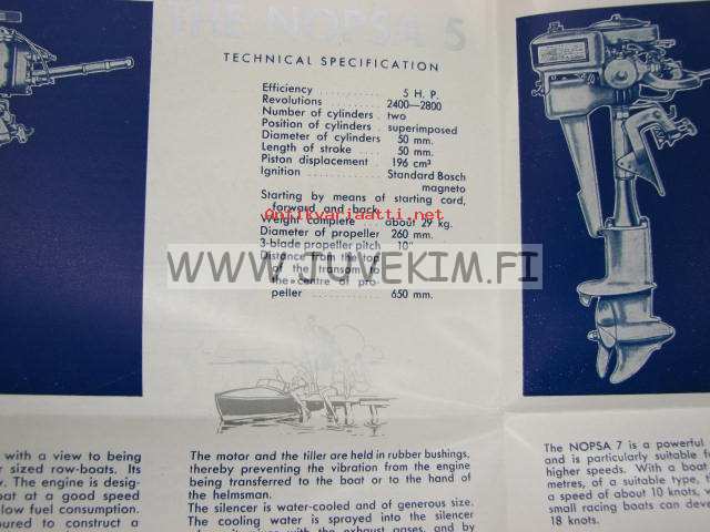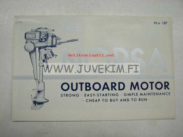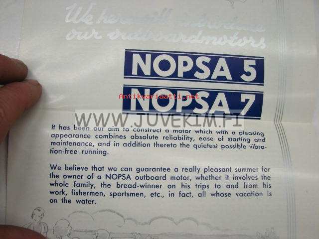 The Nopsa outboard motor, Rosenlew, Pori -ulkolaitamoottori / perämoottori -myyntiesite, englanninkielinen