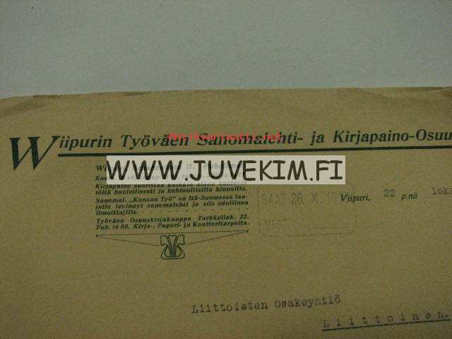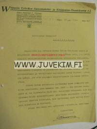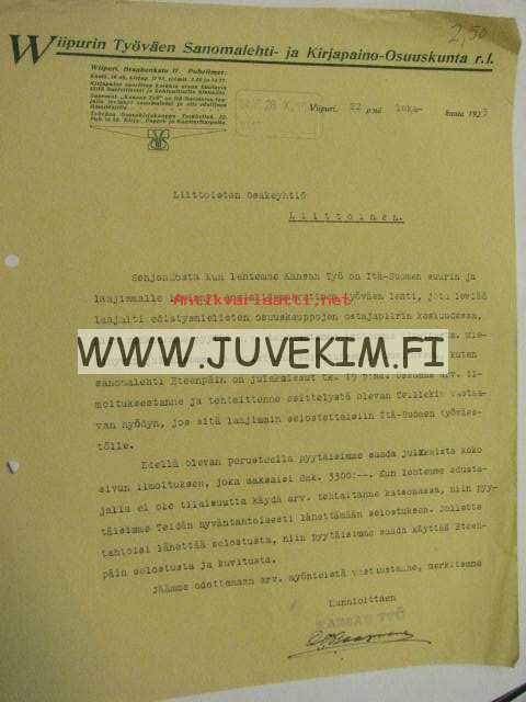 Wiipurin Työväen Sanomalehti ja Kirjapaino Osuuskunta r.l kirje Littoisten Verkatehtaalle 22.10.1922