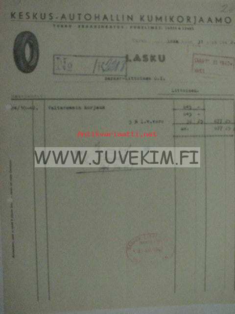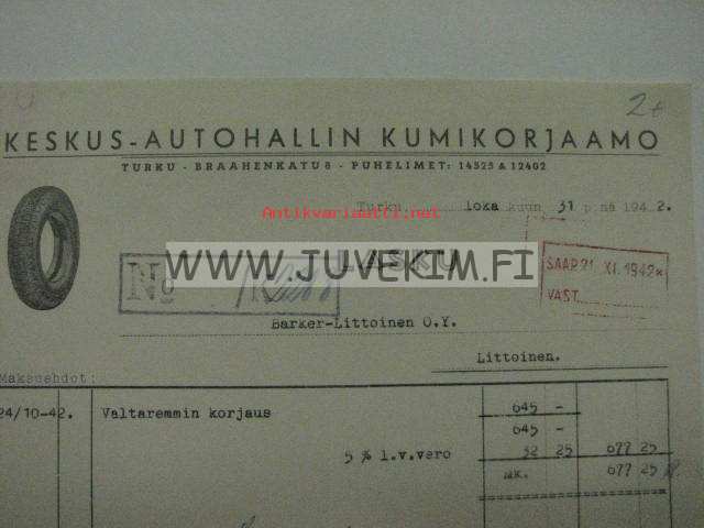Keskus-Autohallin kumikorjaamo Turku, Braahenkatu 8.(Nyk. Brahenkatu) Lasku Barker-Littoinen OY:lle 1.2 .1940