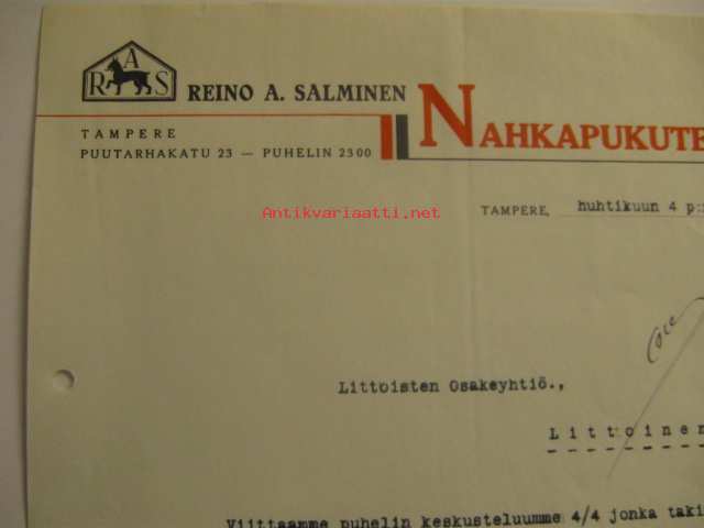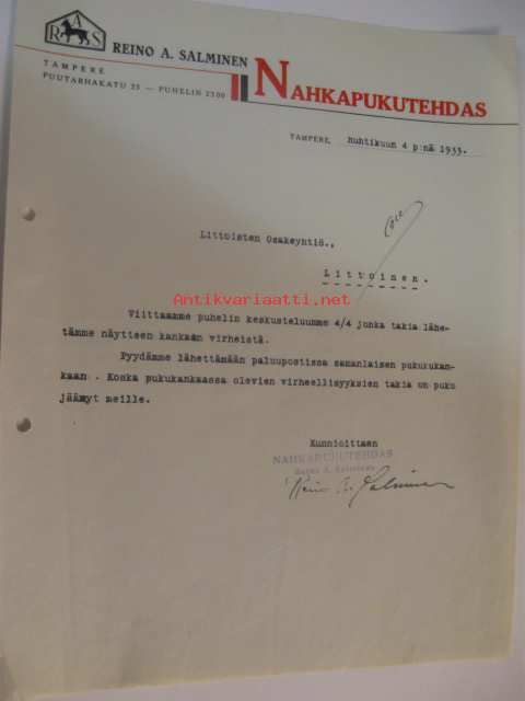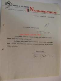 Reino A. Salminen nahkapukutehdas 4.4.1933 -asiakirja