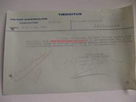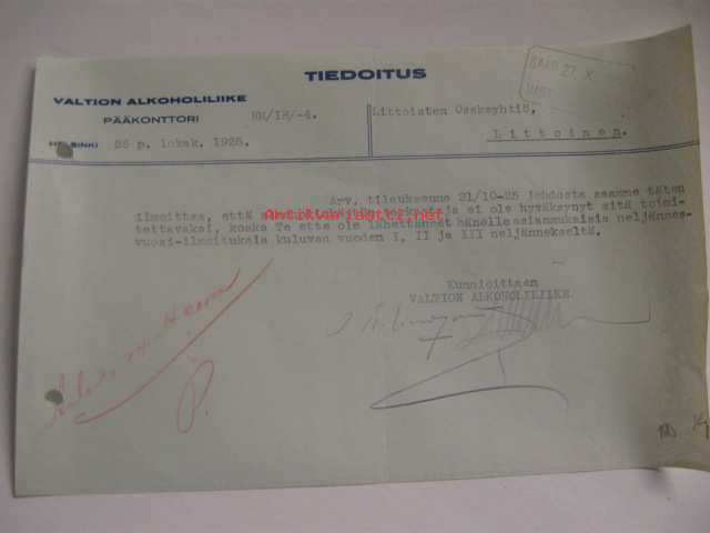 Valtion Alkoholiliike Tiedotus 26.10.1926 -asiakirja