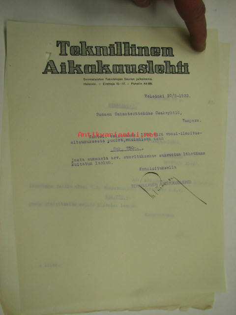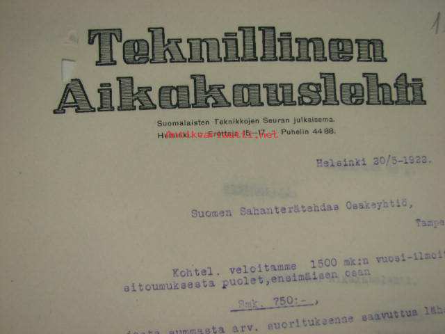 Teknillinen Aikakauslehti Helsinki 20.5.1922 -asiakirja