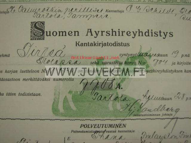 Suomen Ayrshireyhdistys Lehmä "Pirteä", omistaja H. Palmrothin perilliset, Partola, kasvattaja O. G. Schildt, Ilola, Suopelto -kantakirjatodistus 1928