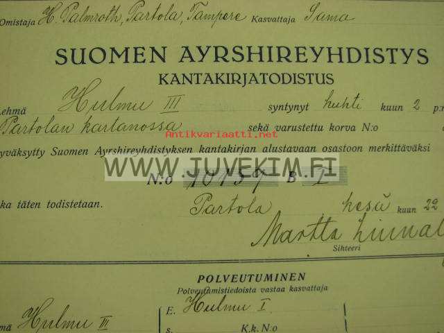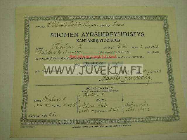 Suomen Ayrshireyhdistys Lehmä "Hulmu III", omistaja Hannes Palmroth, Partola, Tampere -kantakirjatodistus 1923