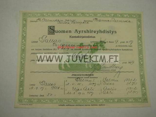 Suomen Ayrshireyhdistys Lehmä "Anna I", omistaja Hannes Palmrothin perilliset, Partolan Kartano, Tampere, kasvattaja Hannes Palmroth -kantakirjatodist