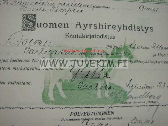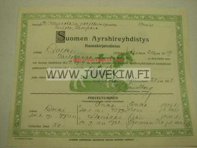 Suomen Ayrshireyhdistys Lehmä "Solki", omistaja Hannes Palmrothin perilliset, Partolan Kartano, Tampere, kasvattaja Qwist -kantakirjatodistus 1928