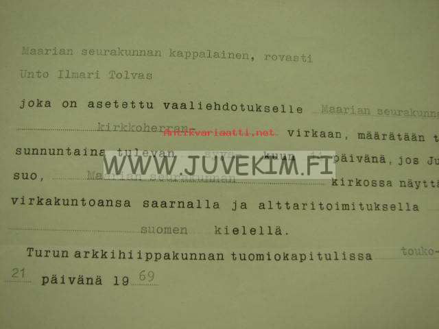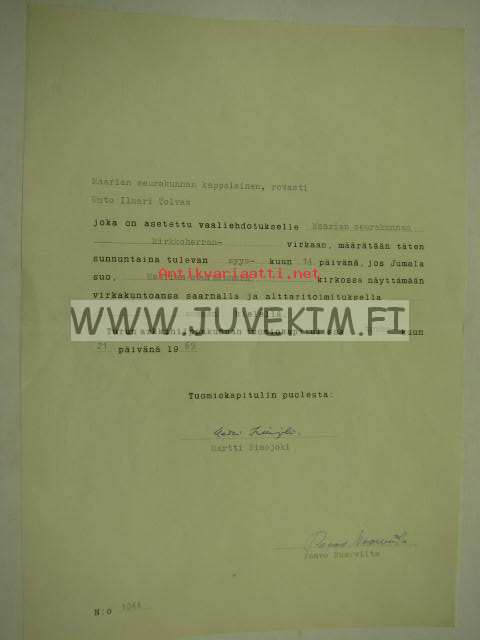 Vaaliehdotus kappalainen Unto Tolvas kirkkoherran virkaan... 1969 -allekirjoitus Martti Simojoki