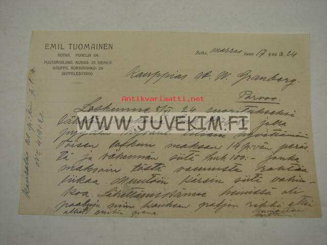 Emil Tuomainen, Kotka 17.11.1924 -asiakirja