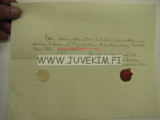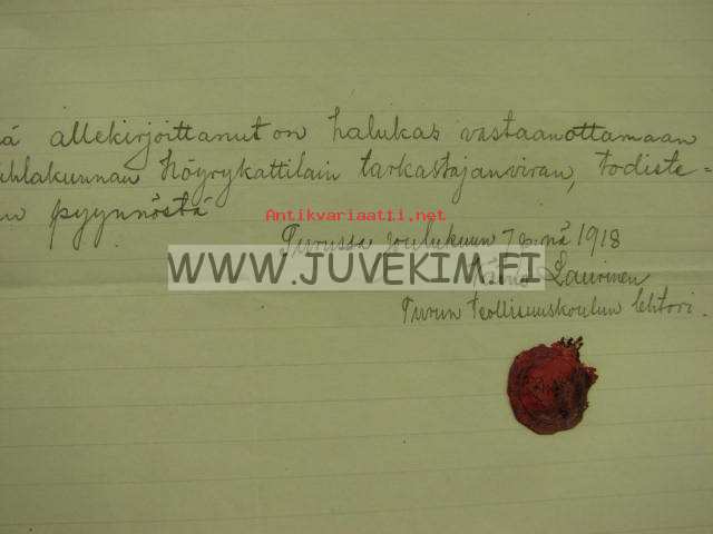 "Että allekirjoittanut on halukas vastaanottamaan Maskun kihlakunnan Höyrykattilaintarkastajan viran... " 1.12.1918 Väinö Laurinen -asiakirja