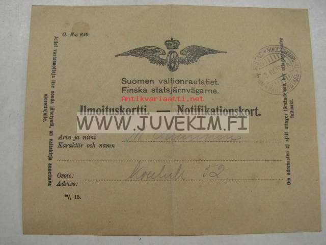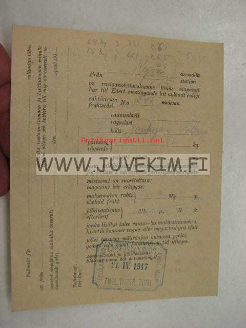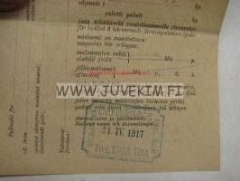Valtionrautatiet ilmoituskortti 21.4.1917 jauhoja & polkupyörä Kyrö -Turku