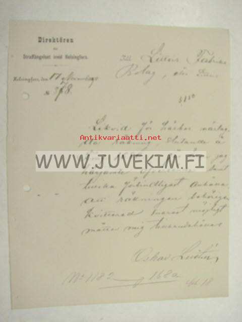 Direktören vid Straffängelset invid Helsingfors, Helsinki, 17.11.1890 -asiakirja