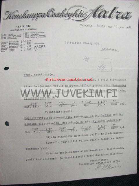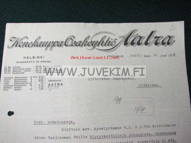 Konekauppa Osakeyhtiö Aatra Tampere 10.4.1922