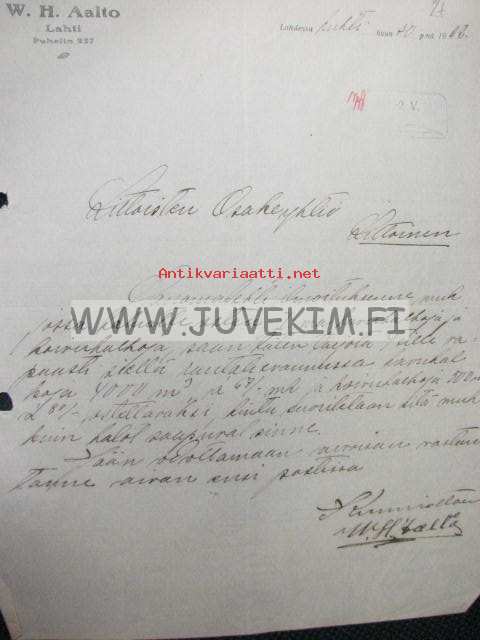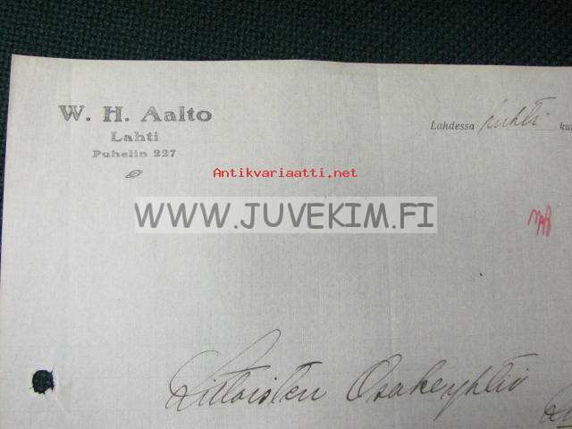 W.H.Aalto. Lahti, 20.4.1922 -asiapaperi