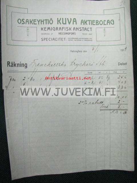 Osakeyhtiö Kuva Aktiebolag, kemigrafisk anstalt, Helsingfors 5.1.1914 asiapaperi, dokument