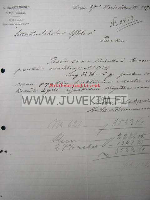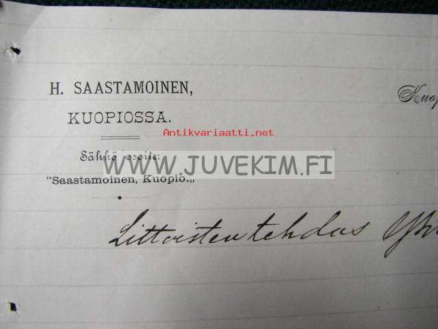 Osakeyhtiö H.Saastamoinen Limited Kuopio 8.7.1890 -asiakirja
