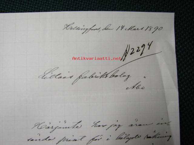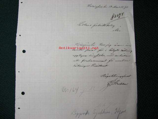 Helsingfors (Helsinki) 14.3.1890 -dokument, asiakirja