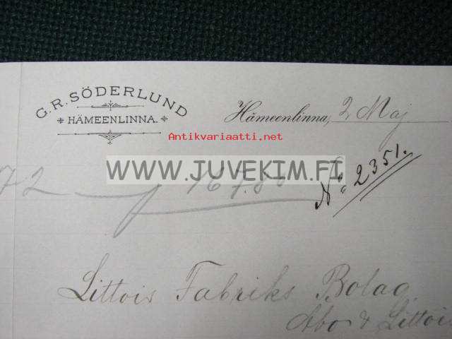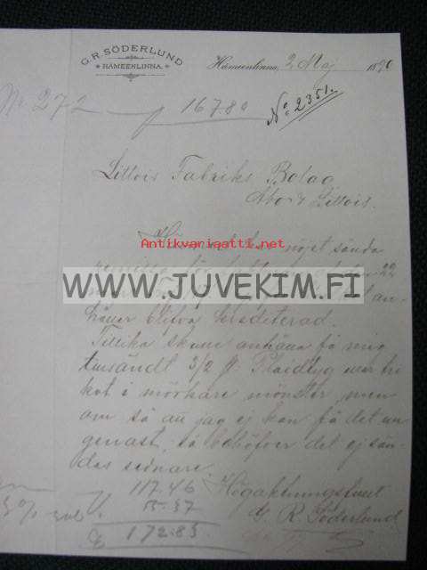 C.R.Söderlund, Hämeenlinna 2.5.1890 -dokument, asiakirja