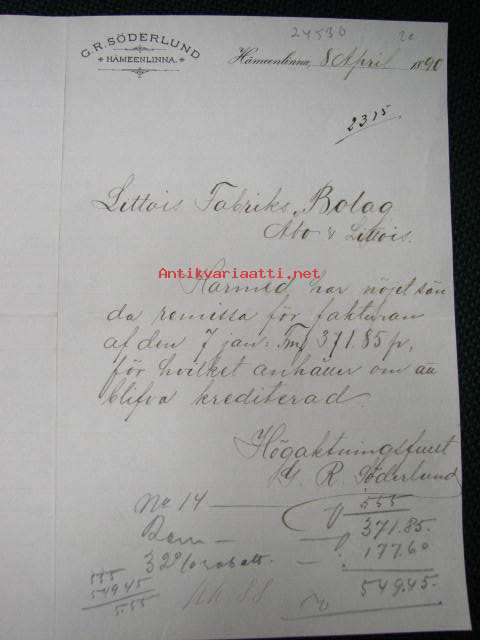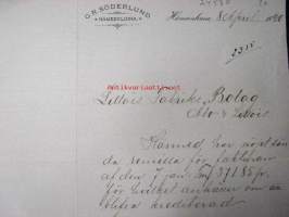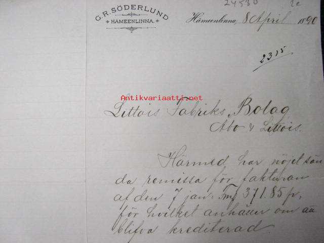 C.R.Söderlund, Hämeenlinna 8.4.1890 -dokument, asiakirja
