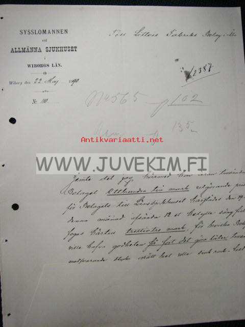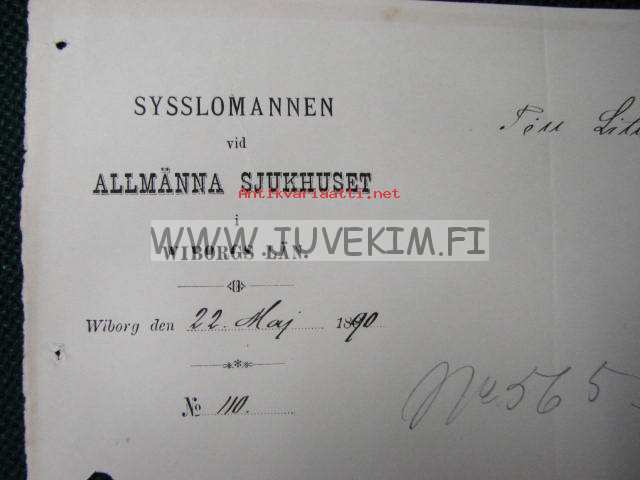 Sysslomannen vid allmänna sjukhuset i Wiborgs län Viipuri 22.5.1890 -dokument, asiakirja