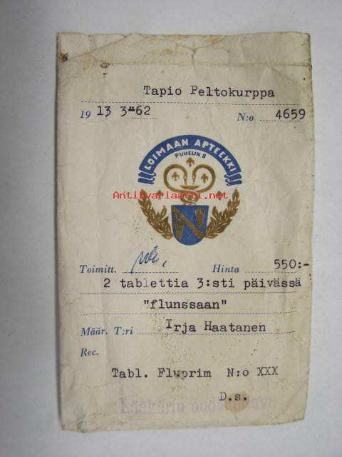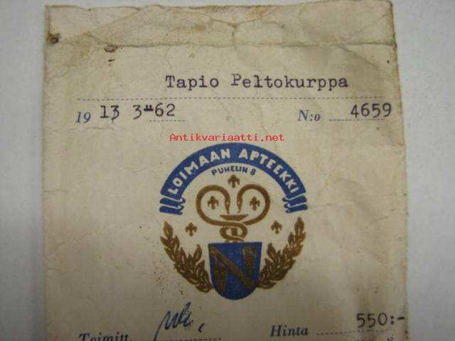 Loimaan Apteekki, 13.3.1962 -apteekkipussi