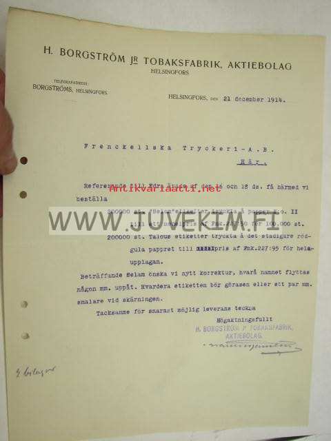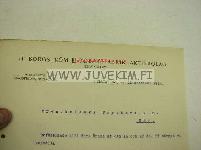 H. Borgström Jr Tobaksfabrik Ab, Helsinki 21.12.1914 -asiakirja