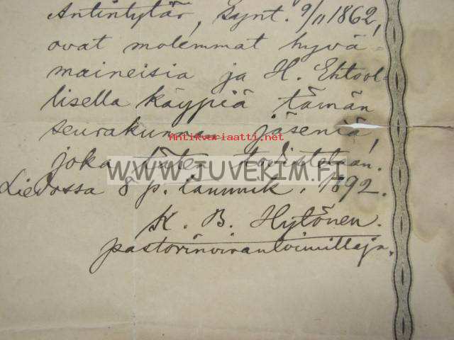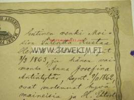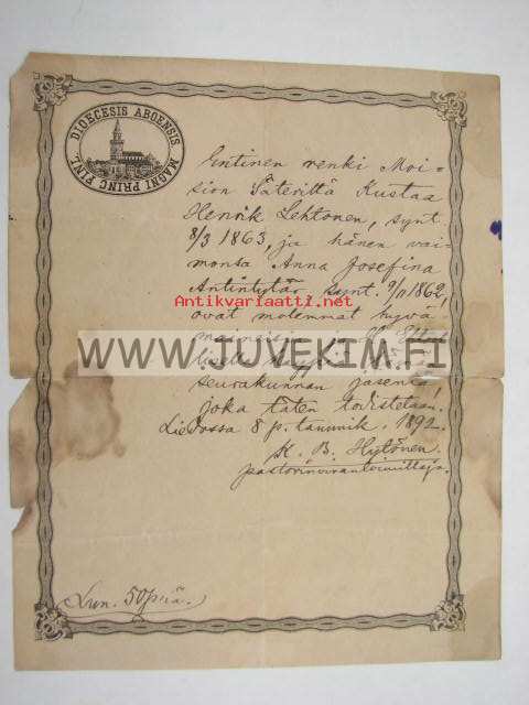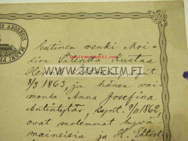 Entinen renki Moision säteriltä Kustaa Henrik Lehtonen, synt. 8.3.1836... -virkatodistus