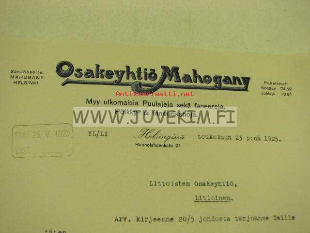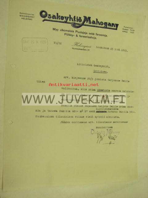 Osakeyhtiö Mahogany, Helsinki 23.5.1925 -asiakirja