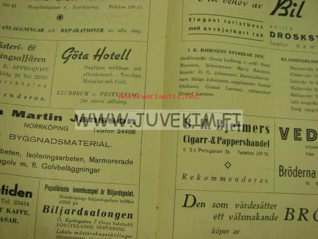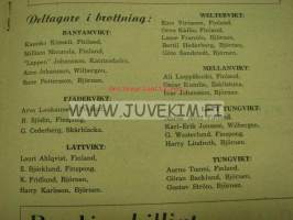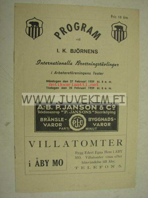 program vid I.K: Björnens Internationella Brottningstävlingar 1939 -painikilpailun ohjelma, mukana suomalaispainijoita Kauko Kiisseli, William Maunula