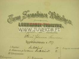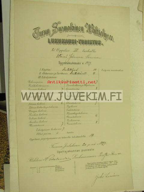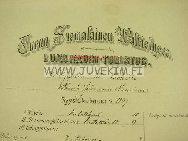 Turun Suomalainen Waltiolyseo, Wäinö Laurinen -lukukausitodistus 1897