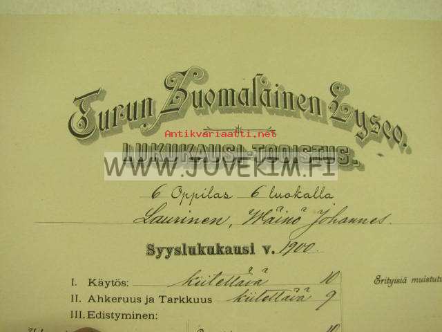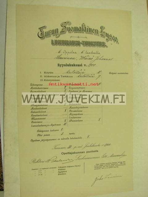 Turun Suomalainen Lyseo, Wäinö Laurinen -lukukausitodistus 1900