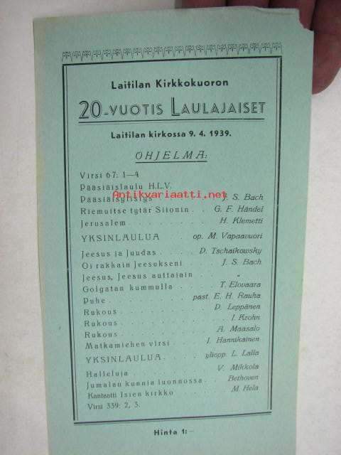 Laitilan Kirkkokuoron 20-vuotis Laulajaiset Laitilan kirkossa 9.4.1939 -ohjelma