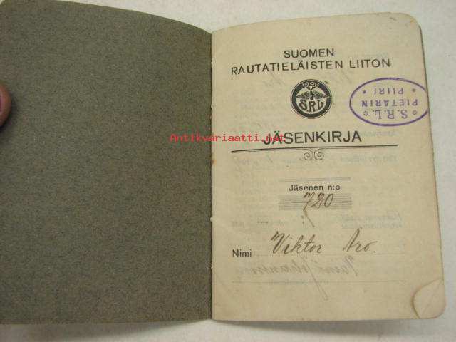 Suomen Rautatieläisten Liitto ry - Jäsenkirja (Kalle) Viktor Aro 1917, SRL Pietarin Piiri