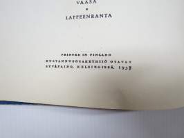 | Saatavilla | 0 kpl (Huom. tuote on myyty! / Sold out!) | | Julkaisuvuosi | 1938 | | Sivuja | 64 | | Painos | 1. | | Kunto | K2 | | Käytetty, kulumia | | Sidonta/painoasu | Kuvitettu kovakantinen | | Kielet | Suomi, Saksa, Ruotsi, Englanti |