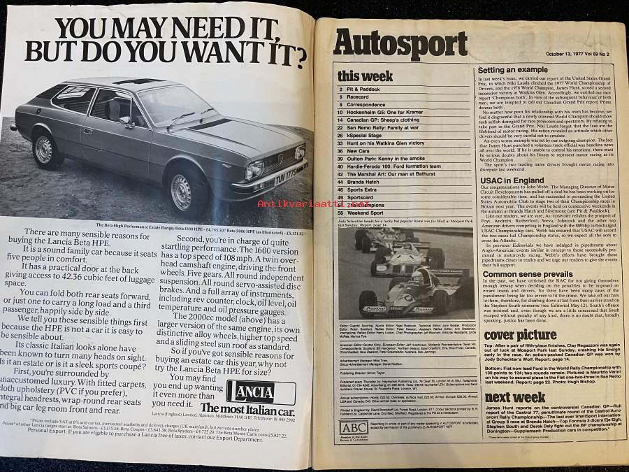 Autosport - Lehti 1977 nr 2 - Action-packed Canadian GP, Fiat regain World Series lead, James Hunt column, Gerry Marshall down-under, Private Ear, ym.