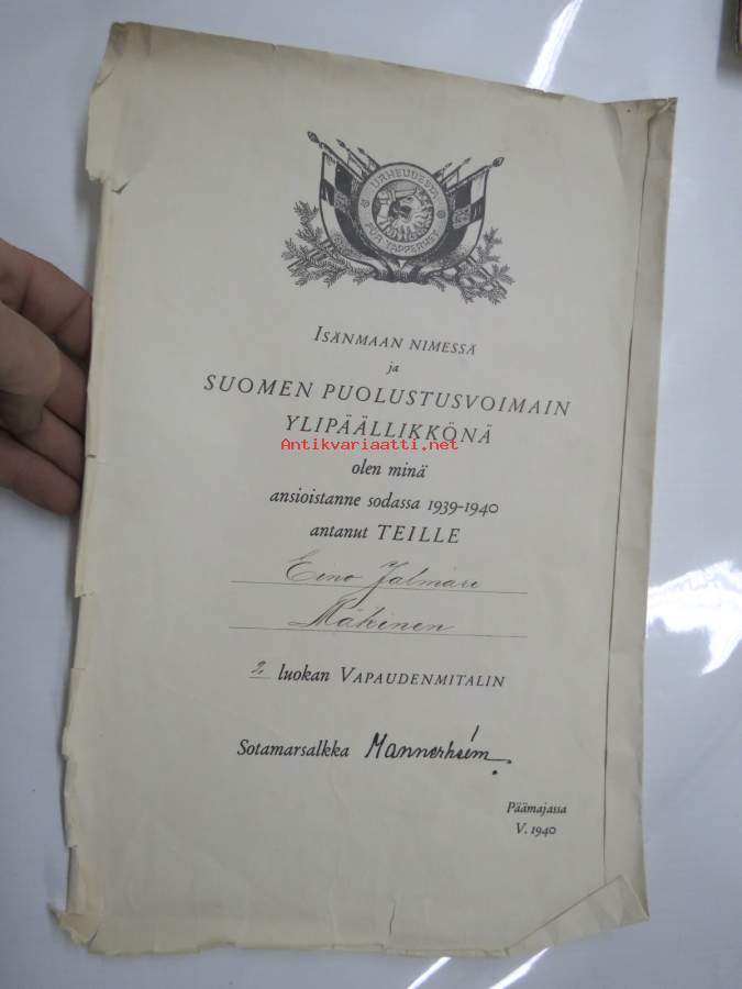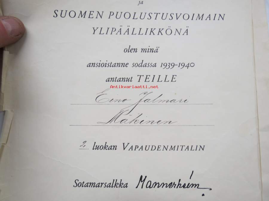 II luokan Vapaudenmitali / E.J. Mäkinen -myöntökirja