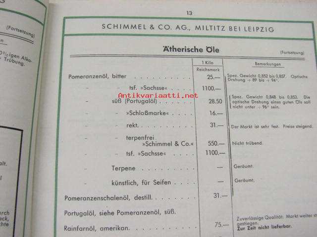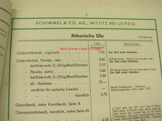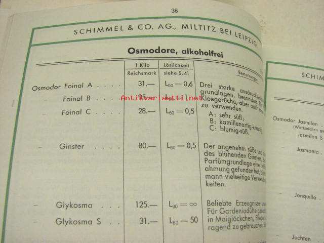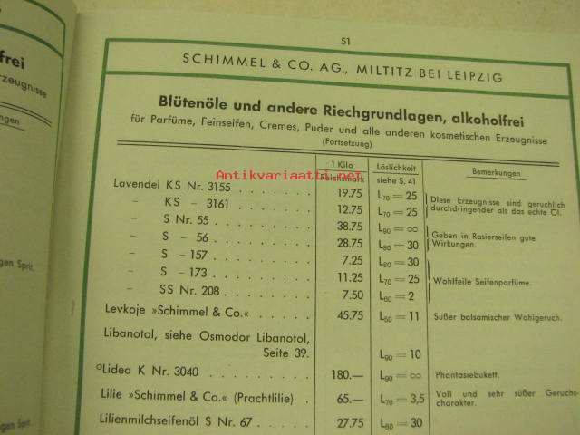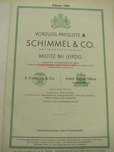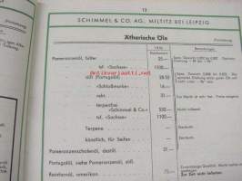 Schimmel & Co Ag 1940 Preisliste -kosmetiikka-alan raaka-aineiden tuoteluettelo ja hinnasto