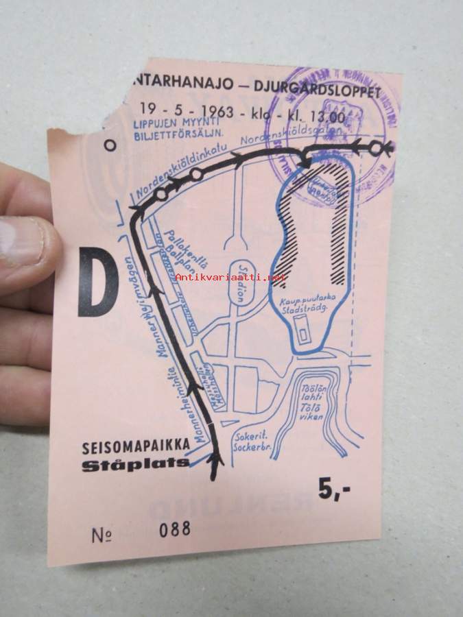 Eläintarhanajo 19.5.1963 D seisomapaikkalippu / sittplats Ståplats nr 088 5 mk