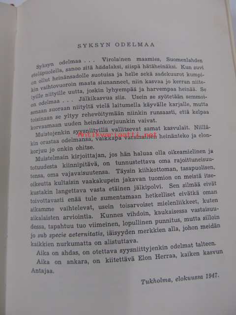 Saatavilla 1 kpl Julkaisuvuosi 1947 Sivuja 210 Painos 1 Kunto K2 Sidonta/painoasu Sidottu (kovak.) Kielet Suomi
