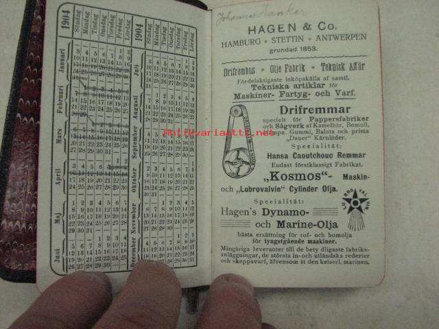 Hagen & Comapany 1904 almanakka / muistikirja (Etulehdellä kirjoitettuna nimi; Johannes Danker)