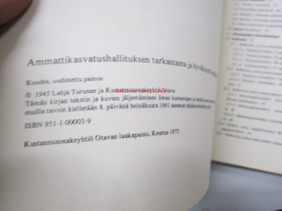 | Saatavilla | 0 kpl (Huom. tuote on myyty! / Sold out!) | | Julkaisuvuosi | 1973 | | Sivuja | 173 | | Painos | 6. uudistettu | | Kunto | K3 | | Sidonta/painoasu | Nidottu (pehmeäk.) | | Kielet | Suomi |