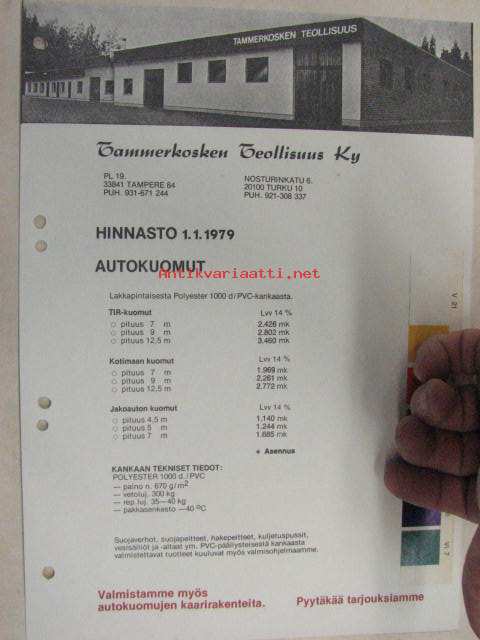 Tammerkosken Teollisuus hinnasto ja värimallit 1979 -myyntiesite