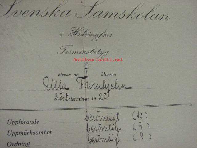 Svenska Samskolan i Helsingfors Terminsbetyg 1920 Ulla Furuhjelm