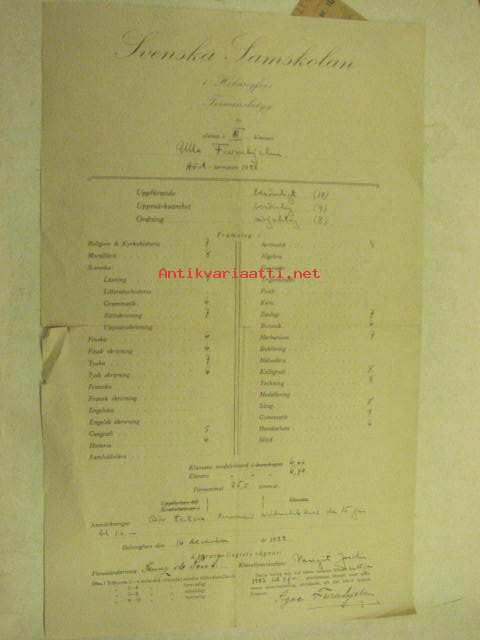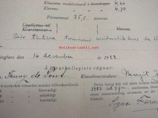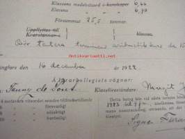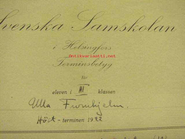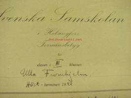 Svenska Samskolan i Helsingfors Terminsbetyg 1922 Ulla Furuhjelm