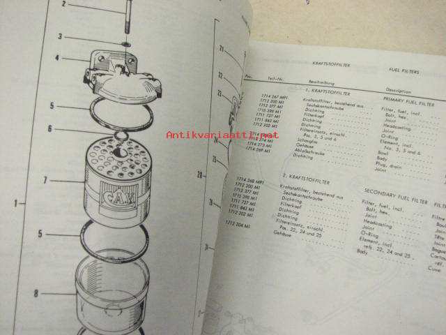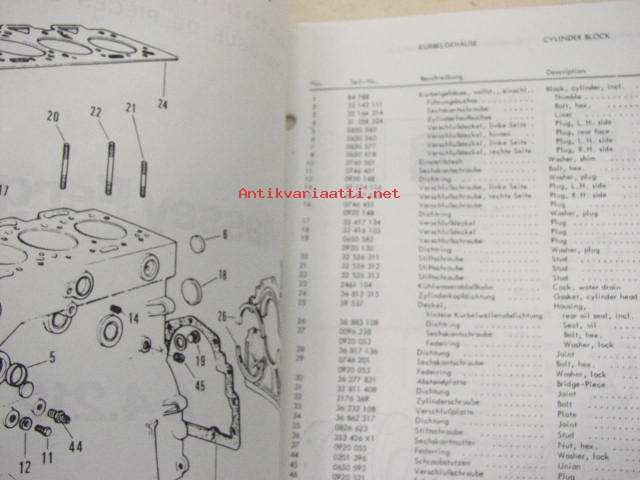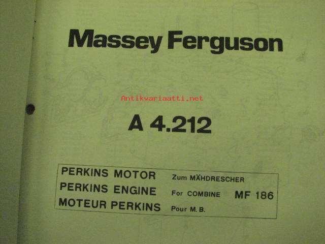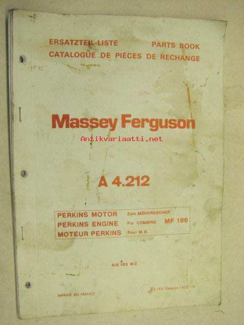 Massey-Ferguson A 4.212 Perkins engine for combine MF 186 419 193 M3 Emission I-V/72 -leikkuupuimurin moottorin varaosaluettelo englanniksi, saksaksi ja ranskaksi