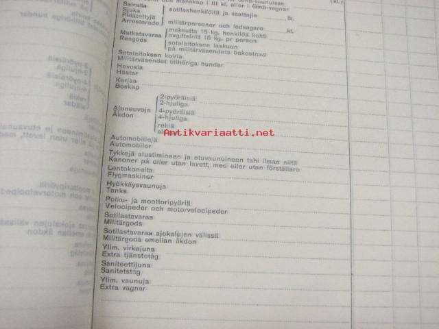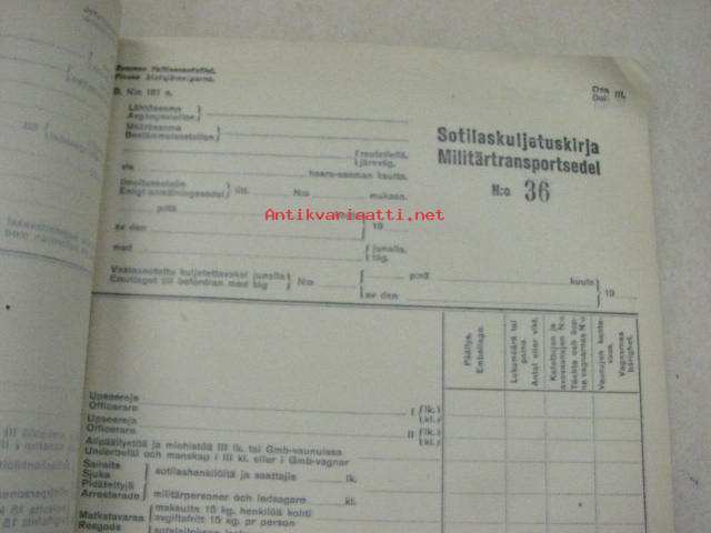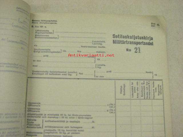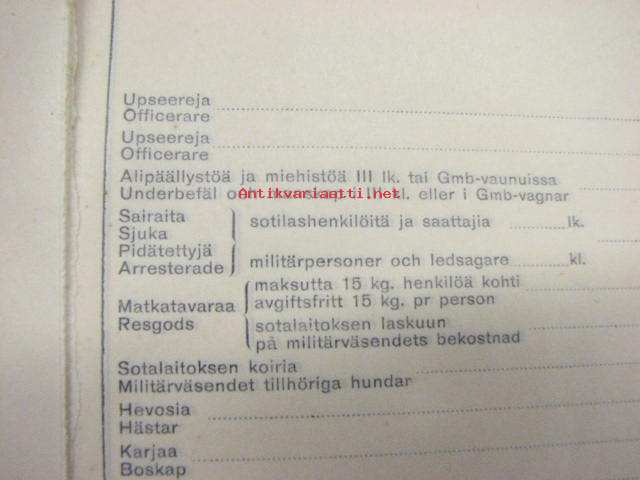 Suomen Valtionrautatiet Kiikka asema Sotilaskuljetuskirja nr 1.