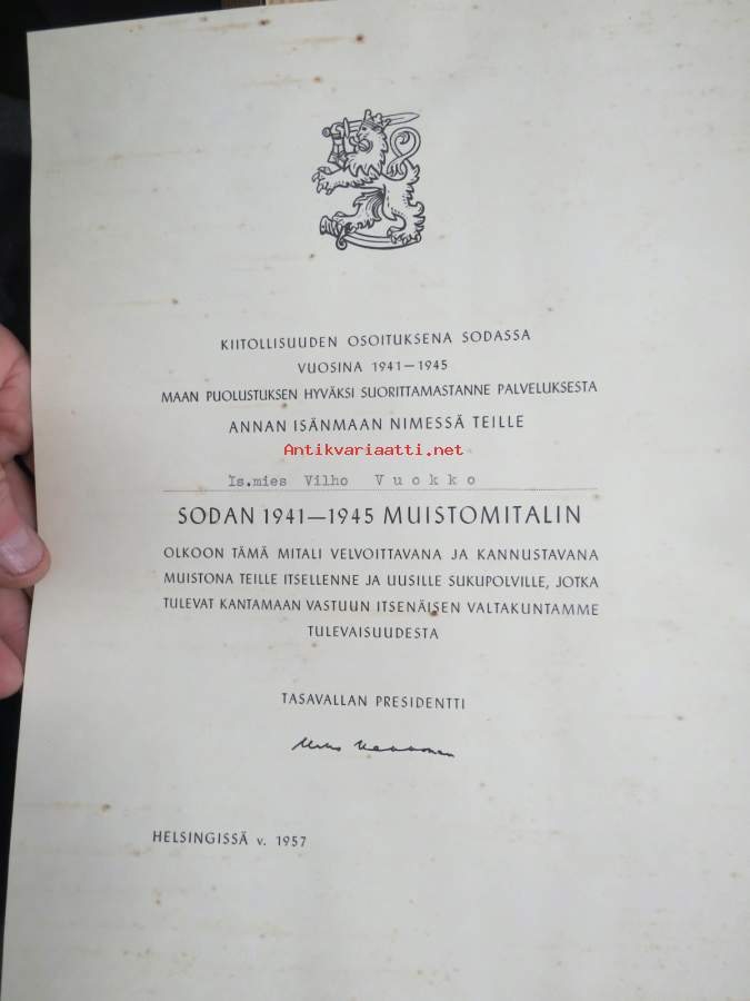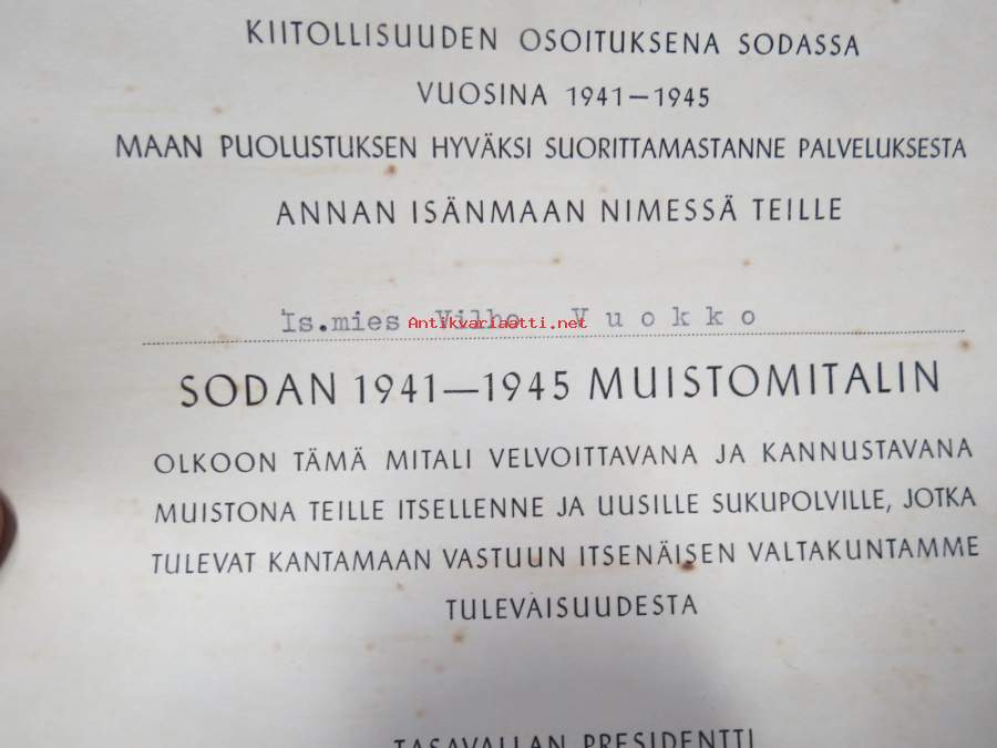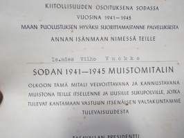Sodan 1941-1945 (Jatkosodan) muistomitalin myöntökirja, ilmasuojelumies Vilho Vuokko, (Turku)