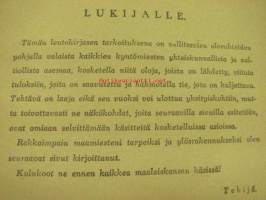 Saatavilla 1 kpl Julkaisuvuosi 1939 Sivuja 31 Kunto K2 Takakansi repeytynyt Sidonta/painoasu Nidottu (pehmeäk.) Kielet Suomi