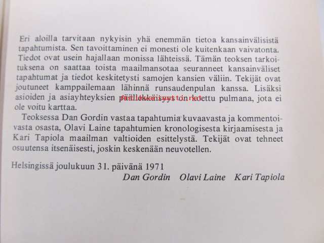 Saatavilla 1 kpl Julkaisuvuosi 1972 Sivuja 440 Painos 1 Kunto K3 Sidonta/painoasu Sidottu (kansipaperit) Kielet Suomi