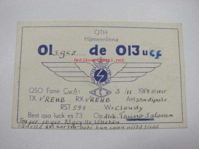OI3DCZ / OI3UCF Ilmavoimat Hämeenlinna 3.11.1954, operator Tauno Salonen -puolustusvoimain radiosähköttäjän yhteyskortti